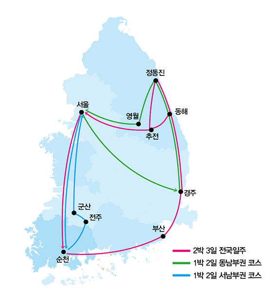 해랑열차의 대표 상품인 전국일주 코스는 서울을 출발해 목포, 여수, 부산, 포항, 강릉, 청량리 등 주요 도시를 경유합니다. 한국의 동쪽과 서쪽, 남쪽의 아름다운 바다와 산, 역사 유적지를 모두 경험할 수 있는 종합 관광 코스입니다. 한국의 전통과 현대를 동시에 체험하고 싶은 여행객에게 이상적인 선택입니다.